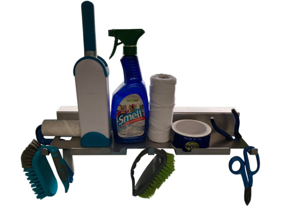 Półka została wykonana ze stali nierdzewnej, można ją zamontować/nałożyć na górną ramę stołu do zwijania dywanów w dowolnym miejscu. Pozwala na wygodne korzystanie z drobnych akcesoriów podczas kontroli jakości i zwijaniu gotowych dywanów tj. taśma, nożyczki, szczotki itp.